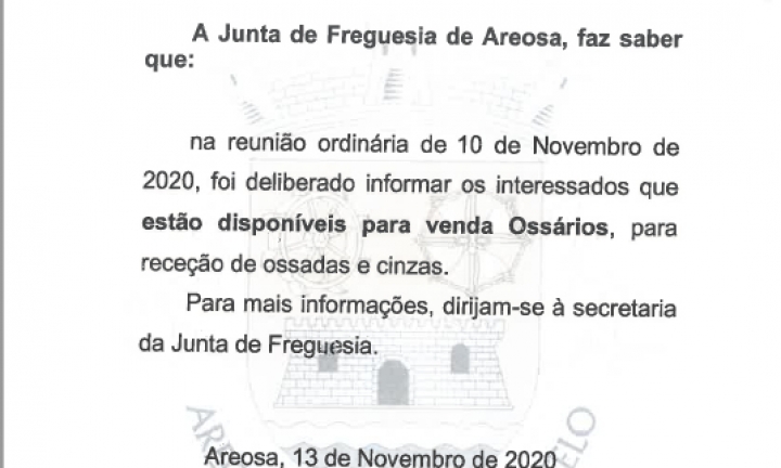 A Junta de Freguesia de Areosa faz saber que na reuniao ordinária de 10 de novembro, foi deliberado informar os interessados que estão disponiveis para venda ossários, para recepção de ossadas e cinzas.