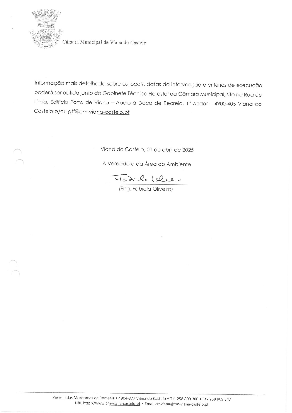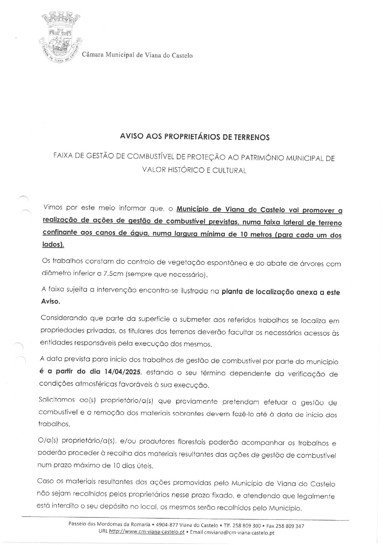 Divulga-se o aviso da Câmara Municipal de Viana do Castelo dirigido aos proprietários de terrenos, com vista à execução da limpeza da faixa de gestão de combustível junto aos canos de água.